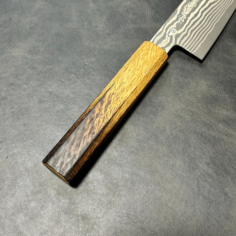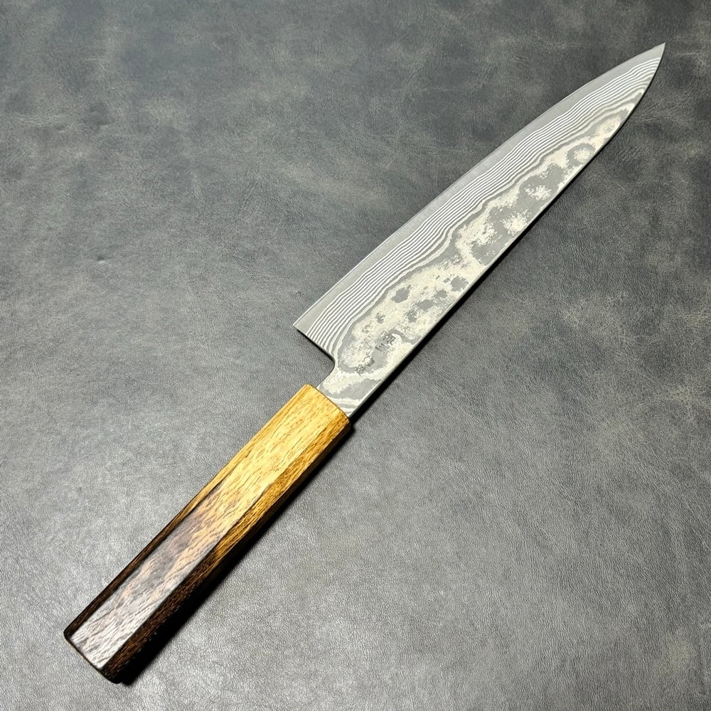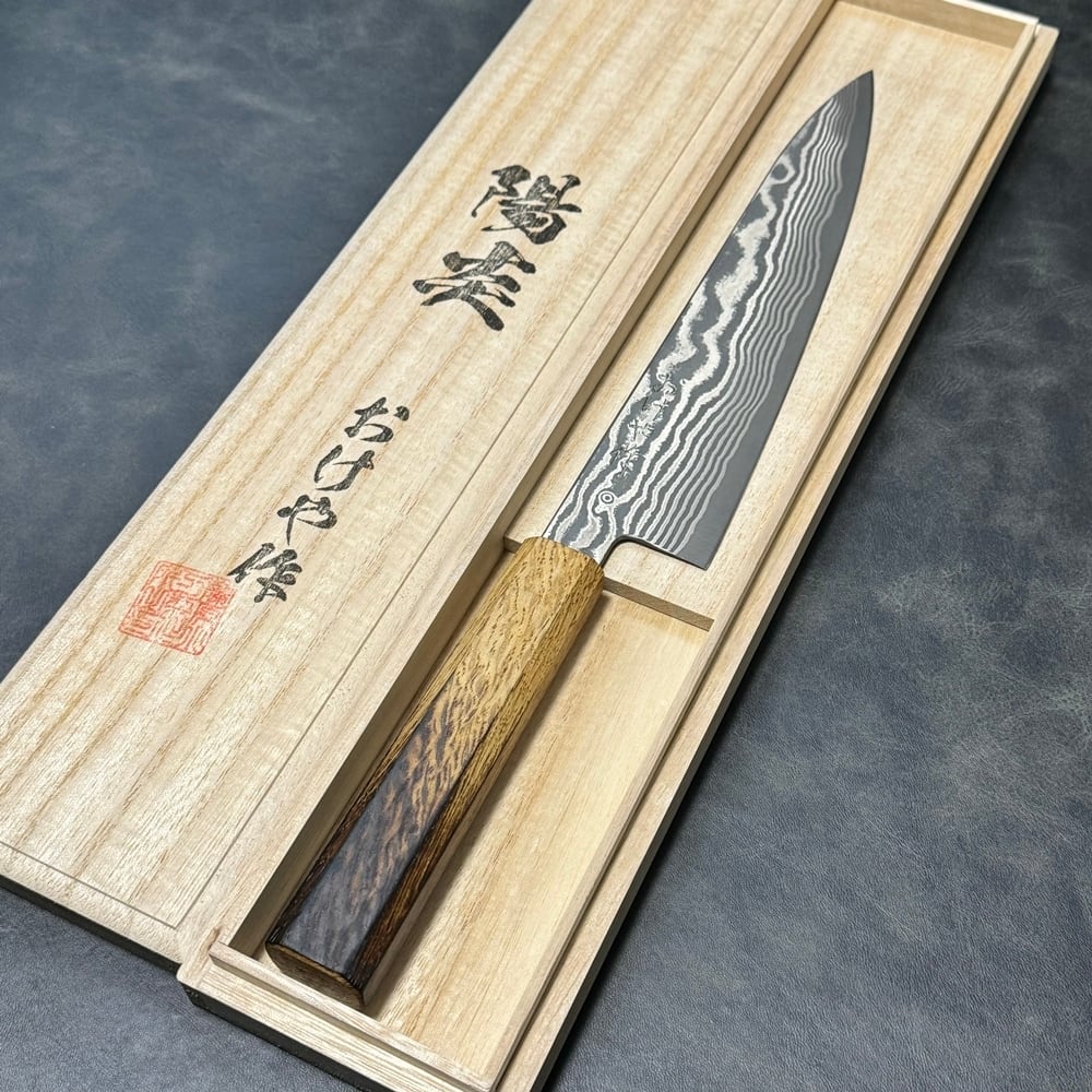 おけや作 陽炎 包丁 牛刀 銀三鋼 ダマスカス 黒仕上げ 210mm 樫焼漆八角柄 三木刃物