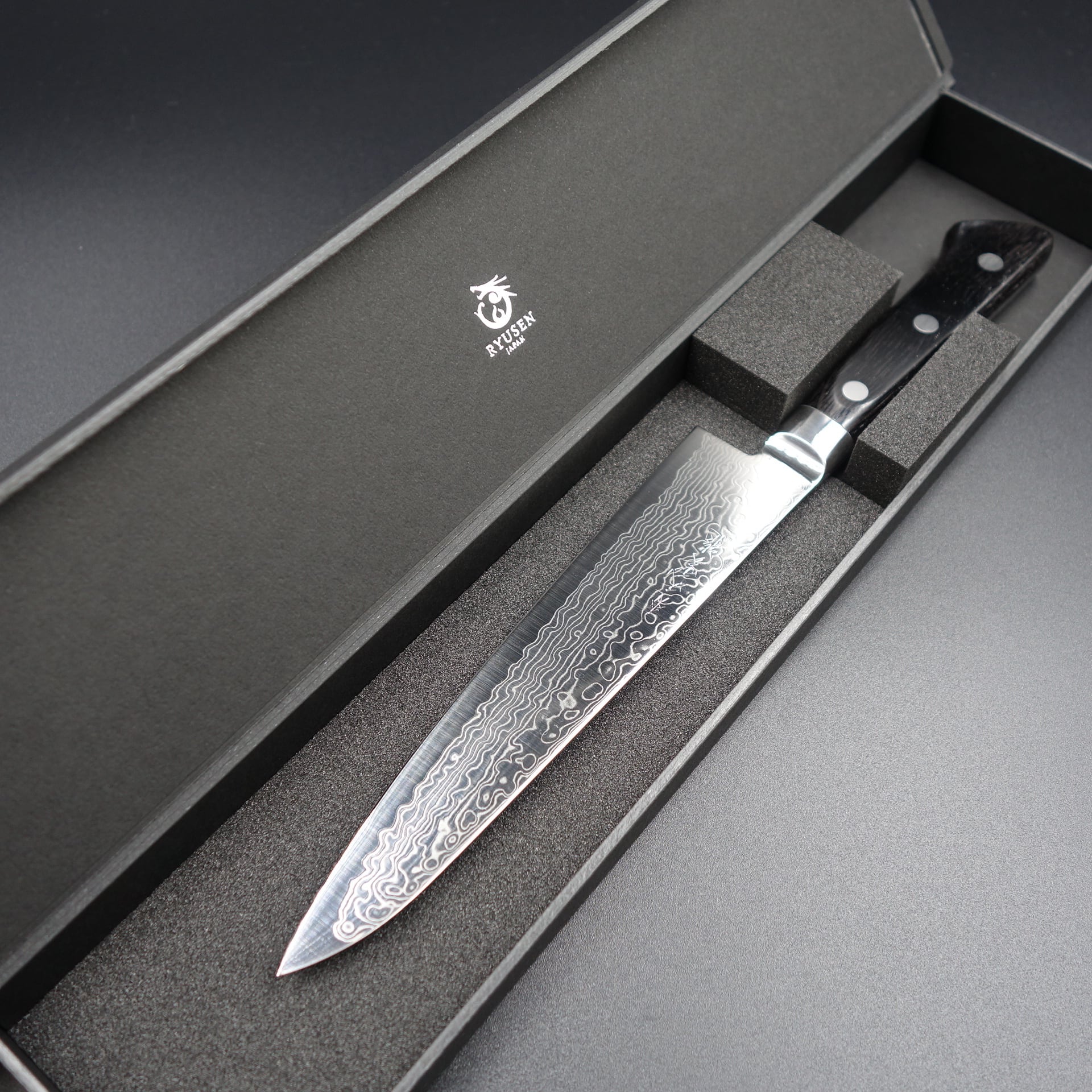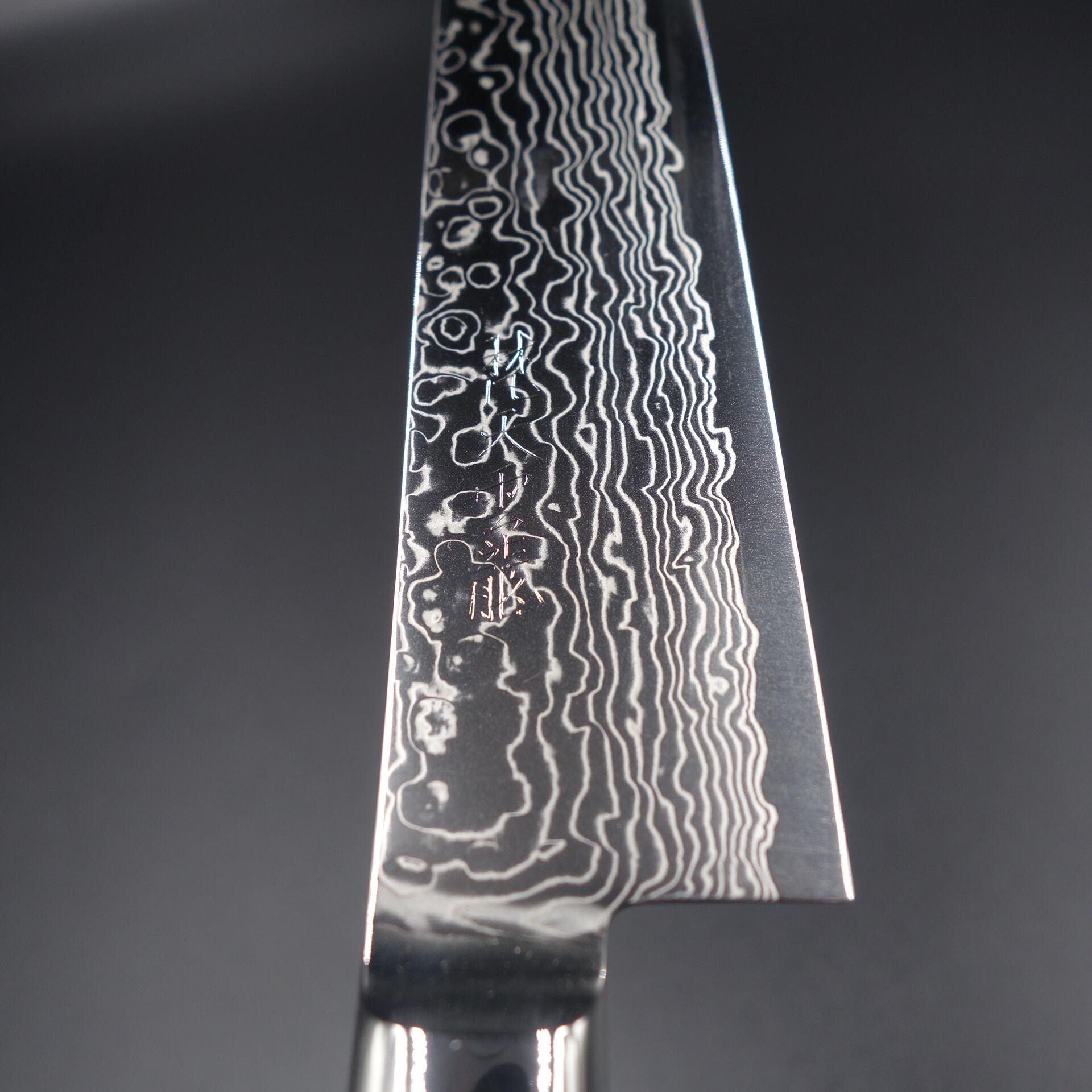 切刃は高品質のモリブデン鋼に、希少金属コバルト・バナジュウムを添加し完成した高級鋼 VG10(V金10号)。そのVG10を63層に重ねたニッケルダマスカスで挟み込み、職人の手により、1丁1丁鍛造。鋼の緻密さと切れ味の良さを追求しました。砥ぎやすくメンテナンス性にも優れています。
