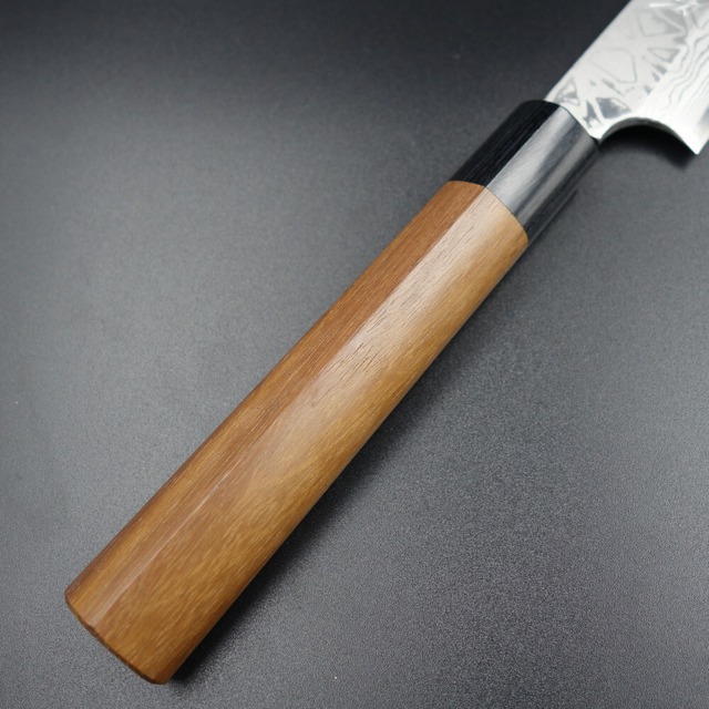柄は紫檀シノギを使用しており、10層のダマスカスで見た目が美しい和包丁に仕上がりました。