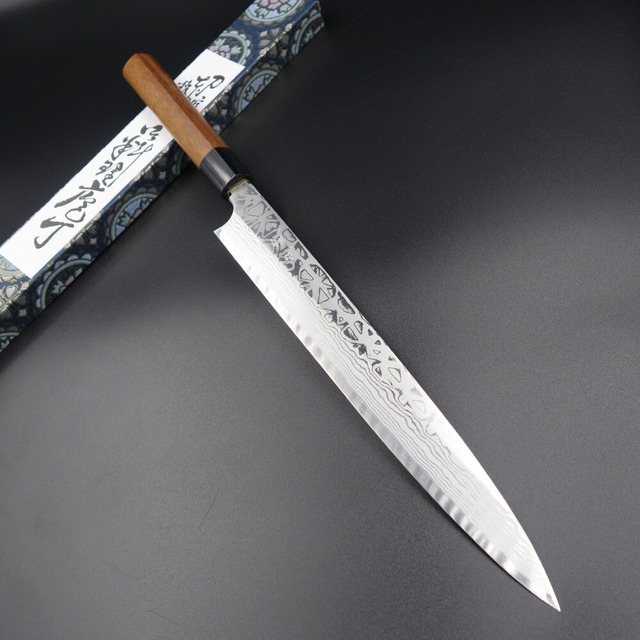 仙助 柳刃包丁 ダマスカス 安来鋼青紙2号 270mm 紫檀シノギ柄