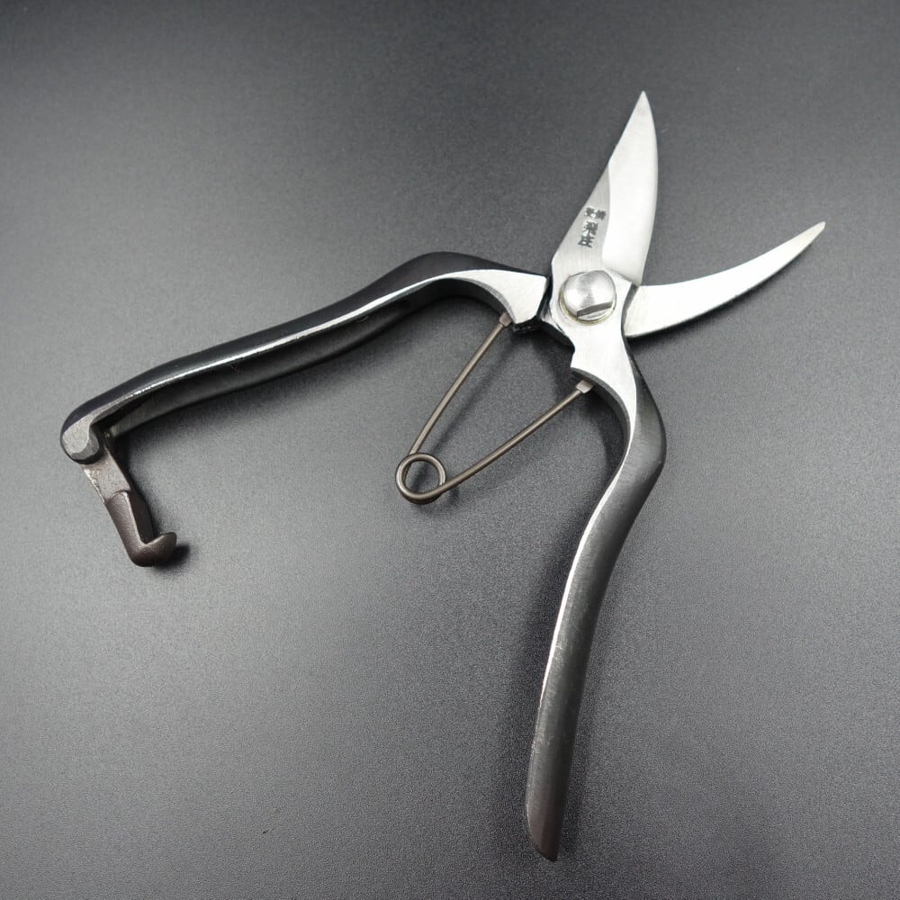 飛庄の片刃芽切鋏は緻密な切れ味で、花や木の枝などを綺麗に切ることができます。片刃なので、細かな作業にも便利です。刃先は細く曲線を描き、しなやかに切れるように設計されています。