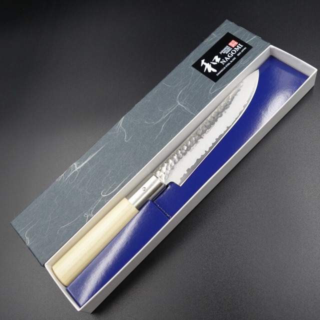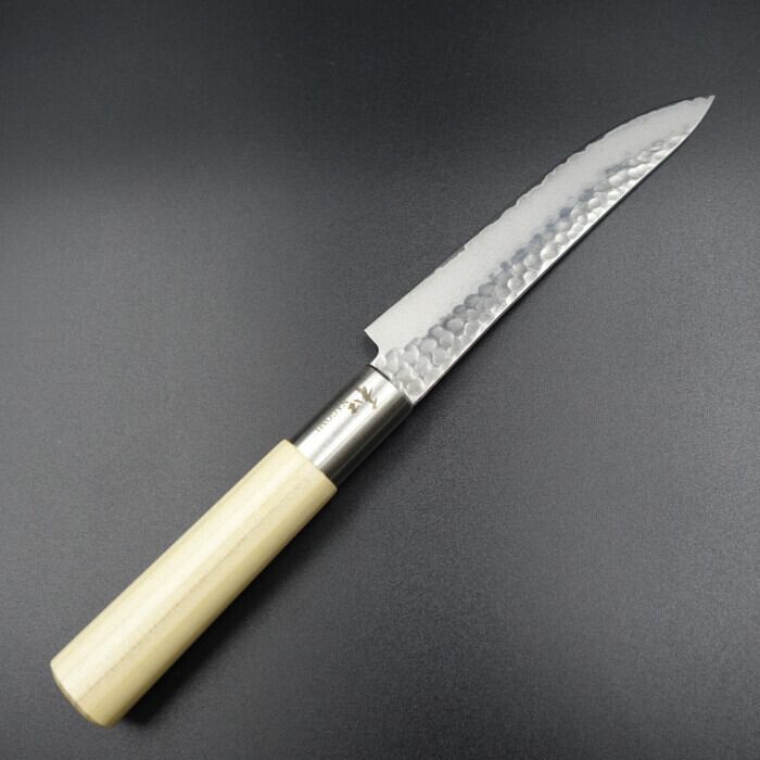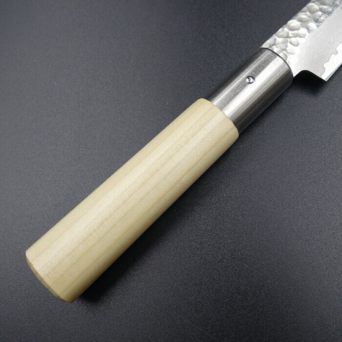 33層のダマスカスの波紋と槌目仕上で、美しい刀身に仕上がっています。ハンドルは持ちやすい白木柄です。