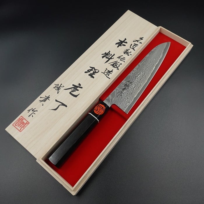 片側16層になるステンレス積層材を鍛造。 柄の部分は最高級材『水牛八角黒檀柄』を使用。重硬さと耐久性が素晴らしく、抗菌・防腐性にすぐれた材です。