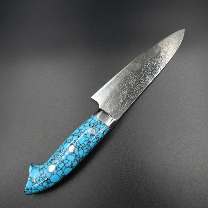 佐治作 ペティ ナイフ R2 粉末ハイス鋼 ダマスカス 150mm 青 ターコイズ ハンドル 越前打刃物