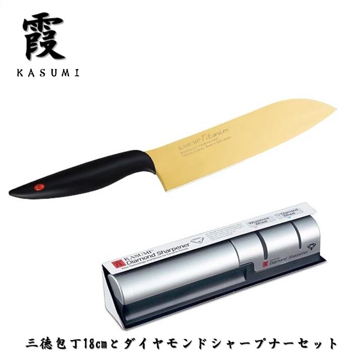 霞 包丁セット 三徳包丁 チタンコーティングゴールド 18cm ダイヤモンドシャープナー セット セット買い KASUMI スミカマ SUMIKAMA