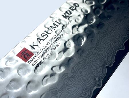 芯材に高炭素モリブデンバナジウム鋼を使用し、その両側には32枚のステンレス層を重ね合わせ本鍛造することにより霞模様が浮かび上がり、更に「鎚目仕上げ」を施すことで、日本古来の包丁イメージを醸し出しております。ハンドルは頑丈な黒積層強化木を八角形状にし、耐久性と高級感を両立した仕上がりになっております。